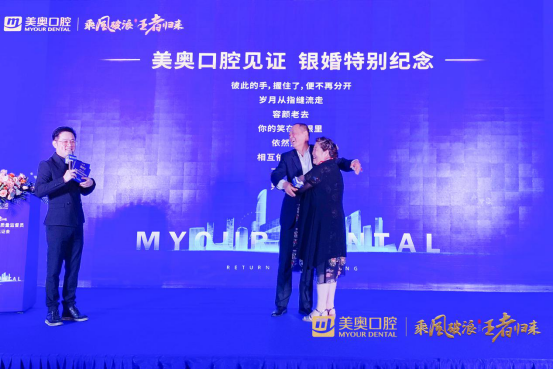 一颗小小的种植牙,可能是打开一个家庭幸福源泉的钥匙。现场还来了两位特别的嘉宾,他们是一对恩爱的老夫妻,阿姨因为缺牙而饱受折磨,叔叔看在眼里疼在心里。就在他们结婚四十周年之际,叔叔在现场为阿姨补办了一场求婚仪式,并将美奥口腔精心准备的一颗Astra种植体作为礼物送给了阿姨。整个过程温馨而感人,引来了台下的阵阵掌声,相信台下也正缺牙的叔叔阿姨们也是感同身受的。
